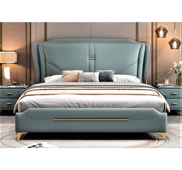 A luxury upholstered bed in soothing aqua blue with golden accents, crafted for modern elegance and unmatched comfort.