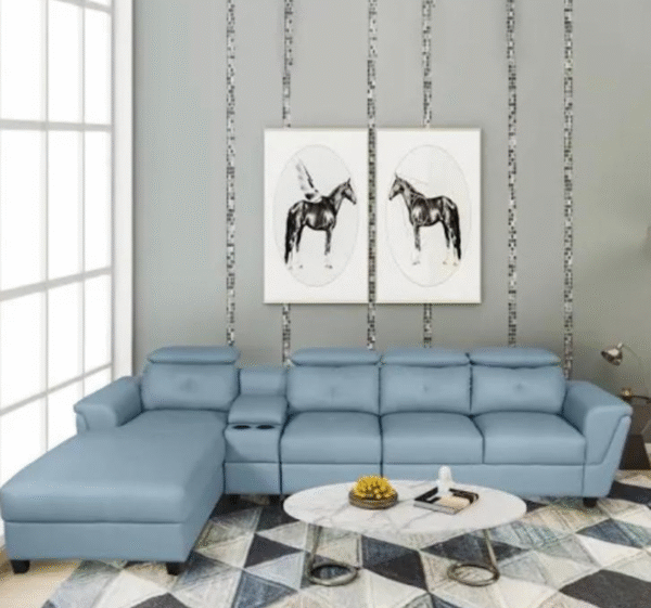 Experience the perfect blend of comfort and elegance with this Blue L-Shape Recliner Sofa. Upholstered in premium leatherette, it comes with plush cushioned seats, adjustable backrests, and a smart built-in cup holder for your convenience. The sleek design and pastel blue color make it a stunning addition to any contemporary living space.