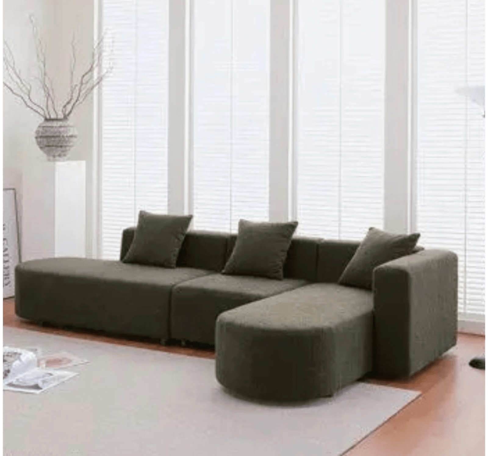 Upgrade your interiors with this Dark Olive L-Shaped Sofa. Built with a strong wooden base and upholstered in premium fabric, this sofa offers ample seating space and a low-profile modern design. The set includes plush cushions for enhanced comfort, making it ideal for lounging, family gatherings, or modern living spaces.