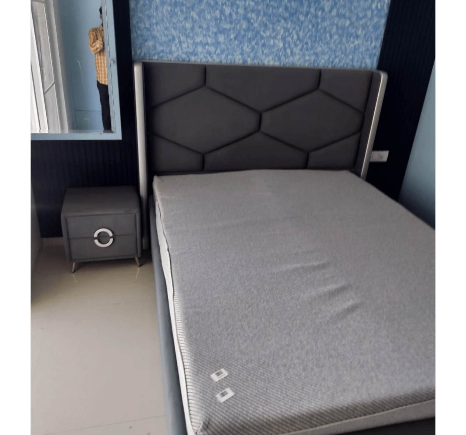 A modern hexa pattern grey bed with a unique geometric headboard design and a strong wooden frame, crafted for style and comfort in contemporary bedrooms.