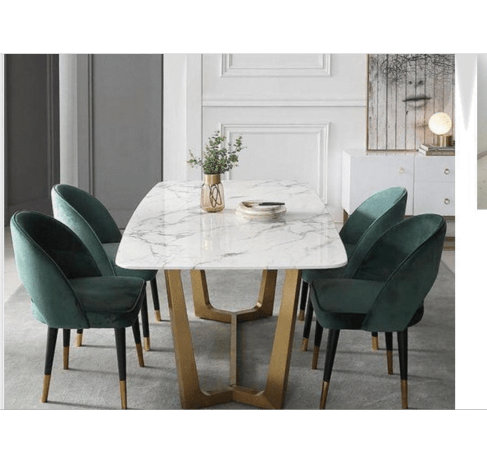 Add a touch of luxury and elegance to your dining area with this 4-seater marble dining table set. The table features a rectangular marble top with natural veining, supported by a sleek golden metal base for both stability and style.
