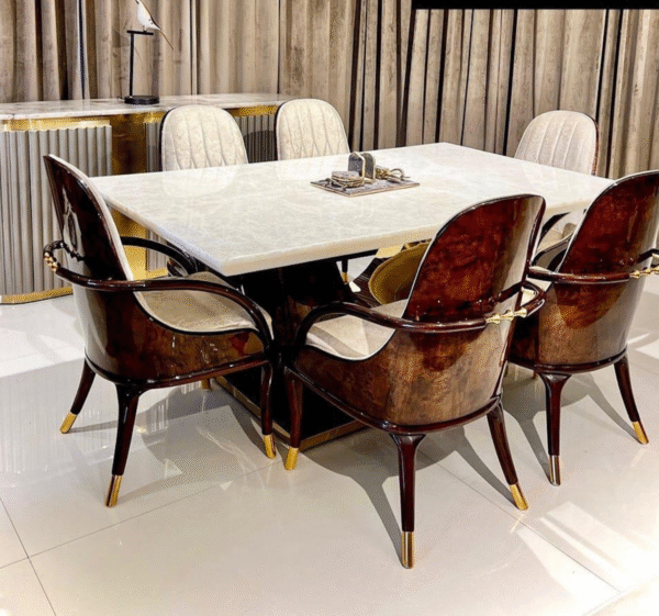 The rectangular white marble top is sturdy, stylish, and easy to clean, supported by a durable wooden base. The set comes with six cushioned chairs crafted from rich wood, designed with a curved backrest and golden-capped legs for a royal touch.