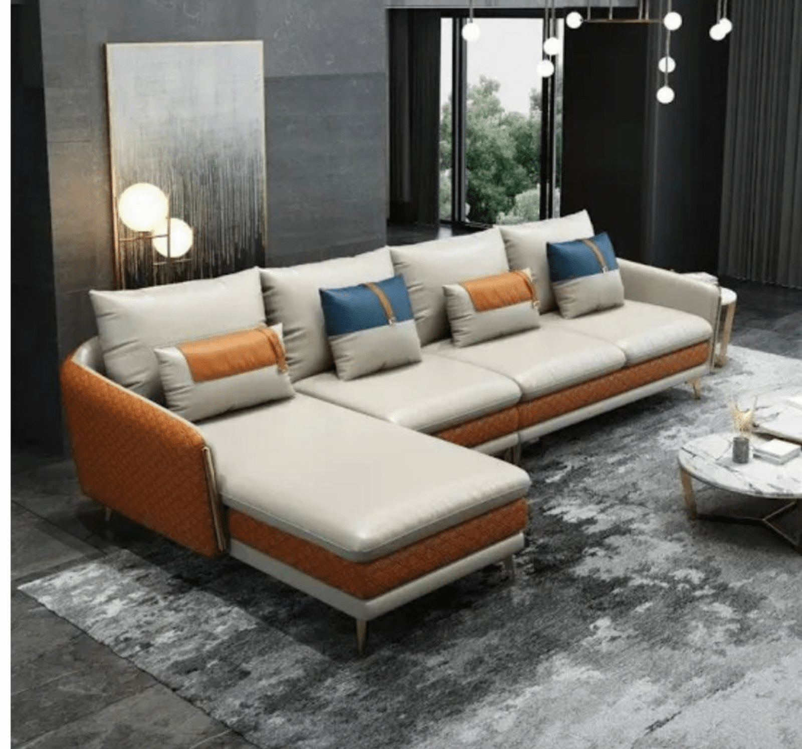 The Luxury Beige & Orange Fabric Sofa is designed to bring modern elegance into your home. Crafted with premium fabric upholstery, this sofa features a sleek beige finish with orange side and base accents for a unique designer look. The chaise lounge provides extra comfort, while the assorted blue, orange, and beige cushions add a pop of color and style. Perfect for luxury apartments, villas, and modern living rooms.