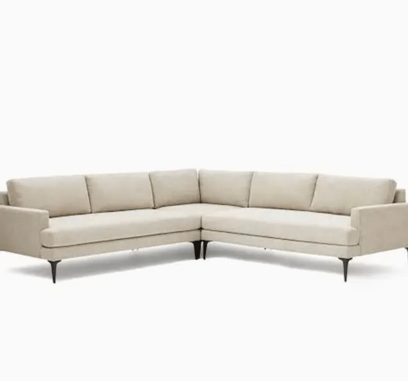 A sleek and minimalist beige L-shaped sofa with slim metal legs and plush cushions – ideal for modern compact living rooms.