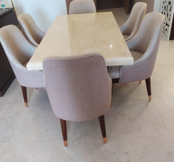 The rectangular marble top in a light cream finish adds sophistication, while the solid wooden legs ensure strength and durability. Paired with six upholstered chairs in premium fabric, the set offers supreme comfort and a modern minimal look for your dining area.