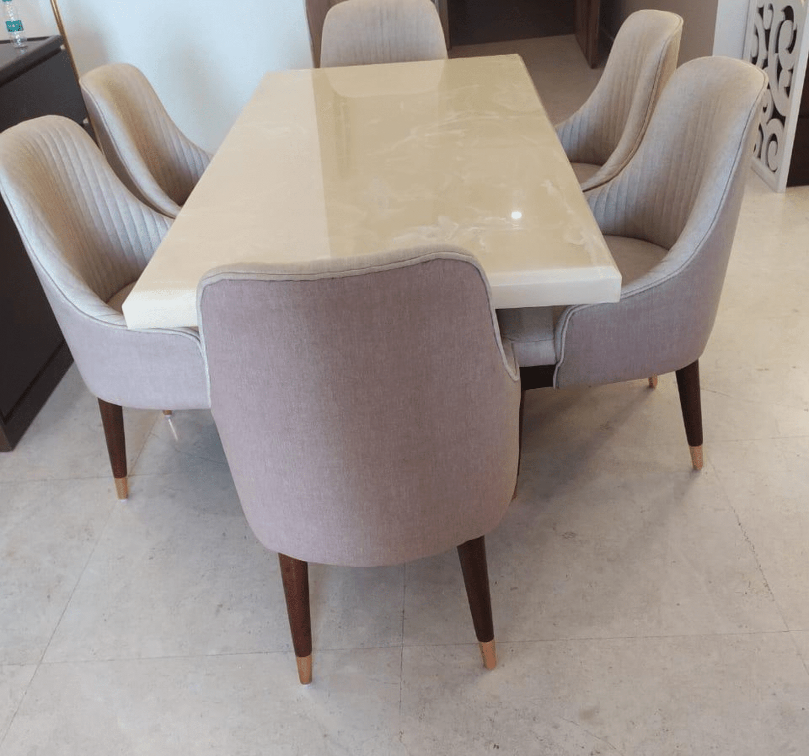 Bring comfort and style together with this modern 6-seater cream marble dining table set.