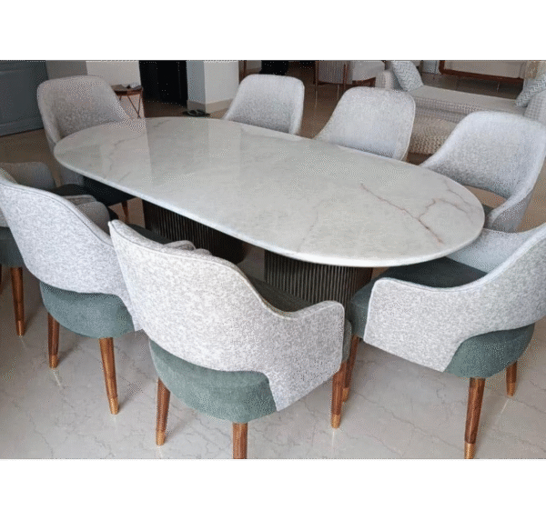 Elevate your dining space with this modern 8-seater dining table set, crafted for both luxury and practicality. The table features a large oval marble top with natural stone-like veining, supported by a sturdy designer base. It comes with 8 upholstered chairs, featuring dual-tone fabric and strong wooden legs for long-lasting comfort.