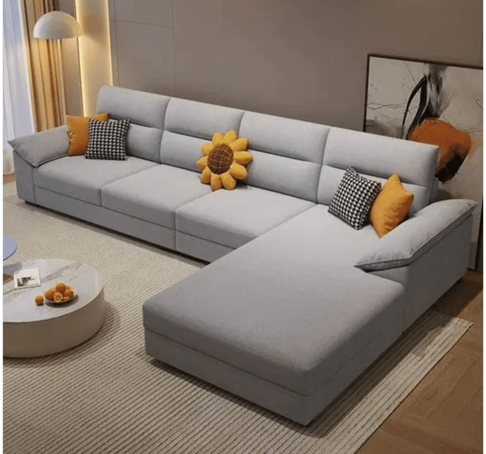 Bring a modern touch to your living room with this Light Grey L-Shaped Sofa Set. Crafted with a sturdy wooden frame and premium fabric, it features a spacious chaise lounge, ergonomic backrest, and plush cushions for maximum comfort. The stylish sunflower and checkered cushions add a playful yet classy vibe.