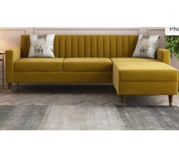 The Mustard Yellow L-Shaped Sofa Set is designed for those who love vibrant and stylish interiors. Upholstered in a premium velvet-finish mustard fabric, this sofa features a sleek silhouette with vertical stitched backrest, slim armrests, and contrasting printed cushions. The L-shape layout offers comfortable lounging space, making it a perfect choice for modern homes.