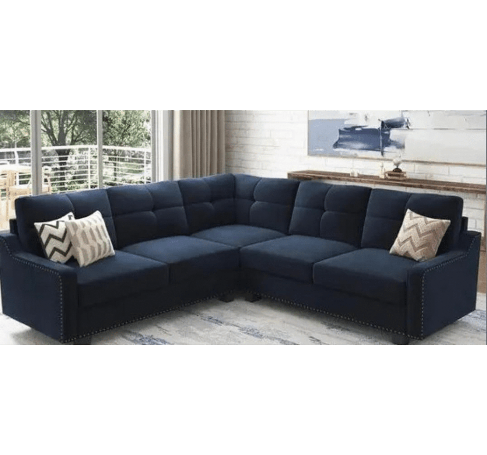 The Navy Blue L-Shaped Sofa Set is a stylish blend of comfort and elegance. Upholstered in deep navy blue fabric, it features a tufted cushion back for plush support and a premium aesthetic. The armrests are highlighted with studded detailing, giving it a sophisticated touch. Its L-shaped design makes it perfect for large living spaces, providing ample seating for families and guests alike.