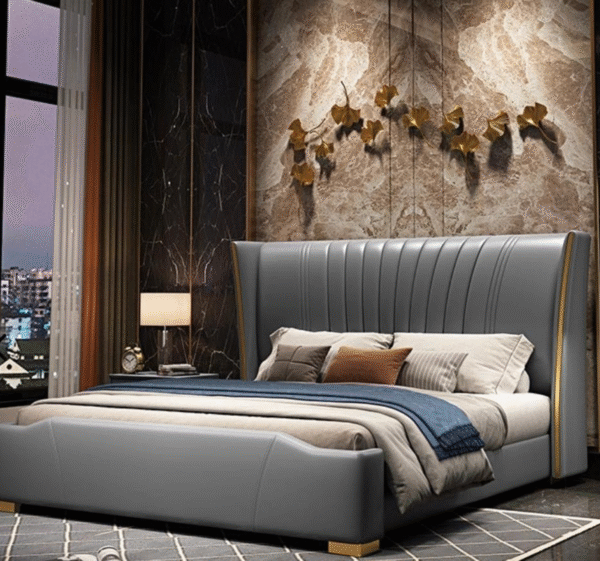 A modern luxury bed with tall curved headboard, sleek stitching lines, and golden accents – perfect for premium bedrooms.