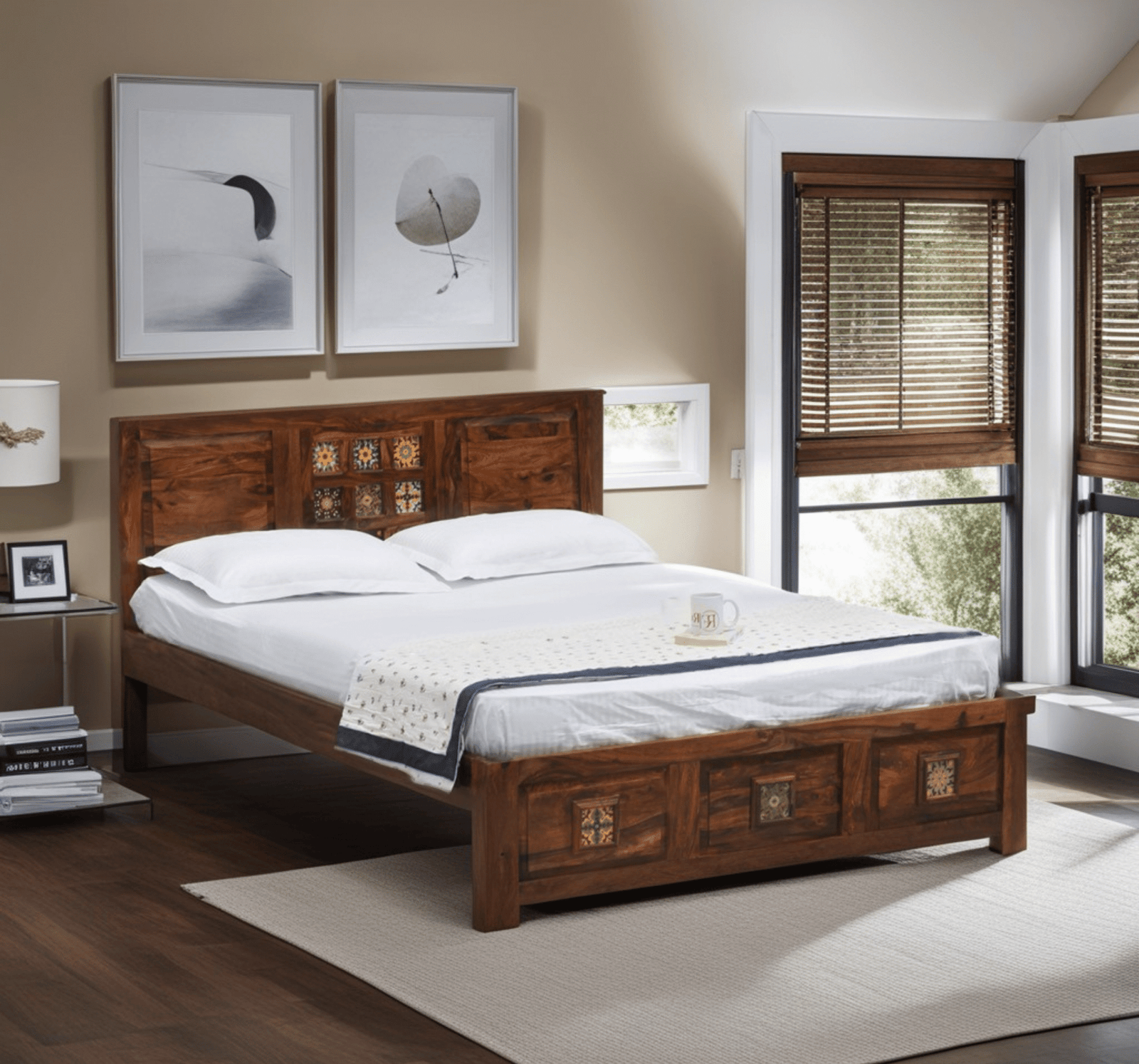 Bring an artistic charm to your bedroom with the Sheesham Tile Inlay Bed. Made from premium Sheesham wood, this bed features intricate hand-crafted tile inlays on the headboard and footboard, adding a unique touch of tradition and creativity.