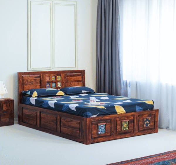 Upgrade your bedroom with the Sheesham Tile Storage Bed, designed to bring artistic elegance and practicality together. Made from solid Sheesham wood, this bed features beautiful tile inlays on the headboard and footboard that add a touch of heritage charm.