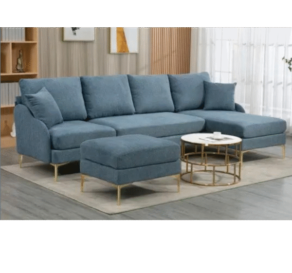 Upgrade your living room with this luxurious sky blue L-shaped sofa set. Upholstered in premium fabric, it features deep cushioning, supportive backrests, and a matching ottoman for versatile use. The sleek gold-finished legs add a touch of modern elegance, making it a perfect centerpiece for contemporary homes.